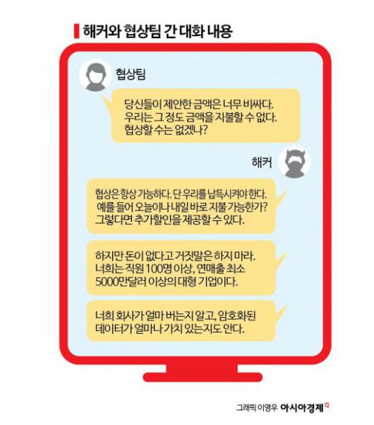 "당신들이 제안한 금액은 너무 비싸다. 우리는 그 정도 금액을 지불할 수 없다. 협상할 수 있나?"(김모씨) "협상은 항상 가능하다. 오늘이나 내일 바로 지불 가능한가? 그렇다면 추가 할인을 제공할 수 있다. 하지만 돈이 없다고 거짓말은 하지 마라. 너희는 직원 100명 이상, 연매출 최소 5000만달러 이상의 대형 기업이다."(해커)