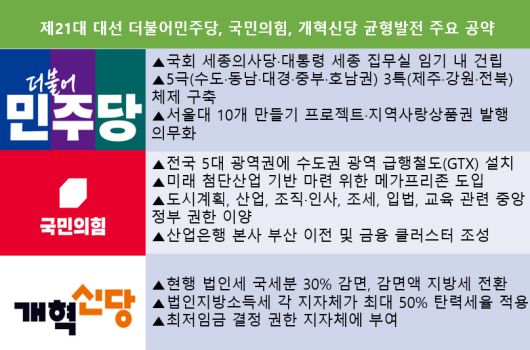 수도권에 인구, 자원, 일자리가 과도하게 몰리면서 지역 간 격차 심화, 지방 소멸 위기로 인한 경고음이 울리는 가운데, 각 당의 대선 주자들이 격차를 해소할 균형 발전 공약을 들고 나와 관심이 모인다.
