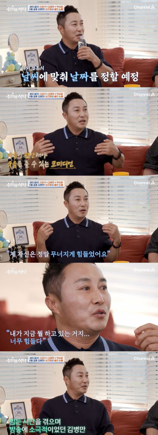 "난 제일 힘들 때가, 코미디언은 집안이 편안해야 하는데 (아닌 거다). 자기가 편안해야 편하게 무대에서 남들을 웃길 수 있다"는 김병만은 "제 자신은 정말 무너지게 힘들었다. 마음은 너무 괴로운데 촬영은 해야한다. 문득 누워서 지금 내가 뭘하는 거지, 너무 힘들다 이런 생각이 들었다. 내가 행복해야 밝은 얼굴을 보여주는데. 그래서 그동안 방송에 소극적이었던 거 같다"고 털어놨다.