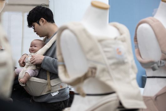 지난해 1월 14일 서울 강남구 코엑스에서 열린 2024 맘스홀릭베이비페어를 찾은 한 아빠가 아기띠를 착용해보고 있다. /뉴스1 |