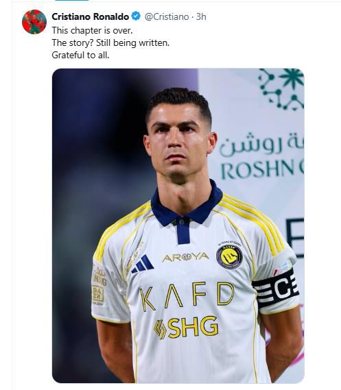호날두는 27일(한국시간) 개인 SNS에 "이번 챕터는 끝났다. 이야기는 계속 쓰이고 있다. 모두에게 감사하다"는 문구와 함께 알나스르 유니폴을 입고 있는 사진을 게시했다.
