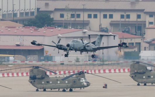 도널드 트럼프 미국 행정부가 주한미군 수천 명을 철수하는 방안을 검토 중이라고 월스트리트저널(WSJ)이 22일(현지시간) 소식통을 인용해 보도했다. 복수의 국방 관계자 등에 따르면, 미국 국방부는 약 4500명의 주한미군을 인도태평양 내 괌 등 다른 기지로 옮기는 방안을 유력하게 검토 중이라고 밝혔다. 사진은 23일 경기 평택시 팽성읍 주한미군기지 캠프 험프리스에 정찰기 RC-12X 가드레일이 이륙하고 있다. 2025.5.23 뉴스1 |