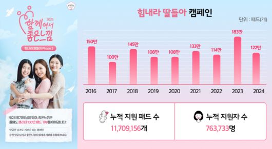 유한킴벌리는 좋은느낌의 ‘힘내라 딸들아’ 생리대 기부 캠페인이 올해로 10년을 맞았다고 27일 밝혔다.