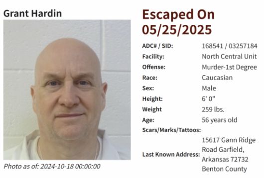 26일(현지시간) AP통신 등에 따르면 미국 교정 당국은 아칸소주와 미주리주 경계에 있는 작은 마을 게이트웨이의 경찰서장을 지낸 그랜트 하딘(56)이 아칸소주 캘리코 락의 교도소에서 전날 오후 3시40분경 탈옥했다고 밝혔다.