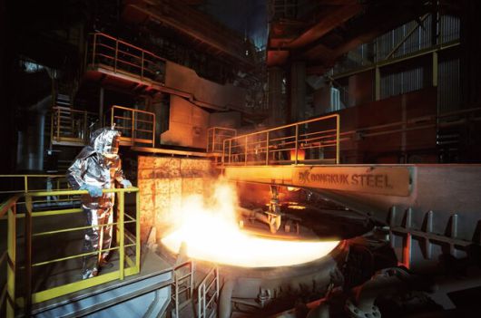 동국제강은 오는 7월 22일부터 8월 15일까지 약 한 달간 인천공장 철근 생산 라인 전체를 중단한다. 인천공장은 연간 220만톤 규모의 철근을 생산할 수 있는 국내 최대 단일 생산 시설이다. 동국제강 인천공장 전기로에서 한 근로자가 작업하는 모습. /동국제강 |