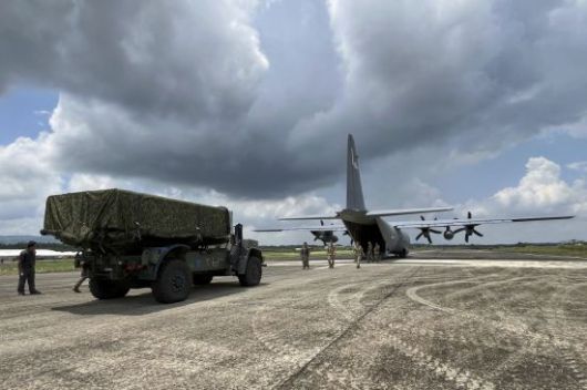 지난달 26일(현지시간) 필리핀과 미국의 대규모 연합훈련인 '발리카탄'에서 미군이 해군·해병대 원정선박 차단체계(NMESIS·네메시스) 장비 일부를 C130 수송기에 싣고 있다. AP연합뉴스 |
