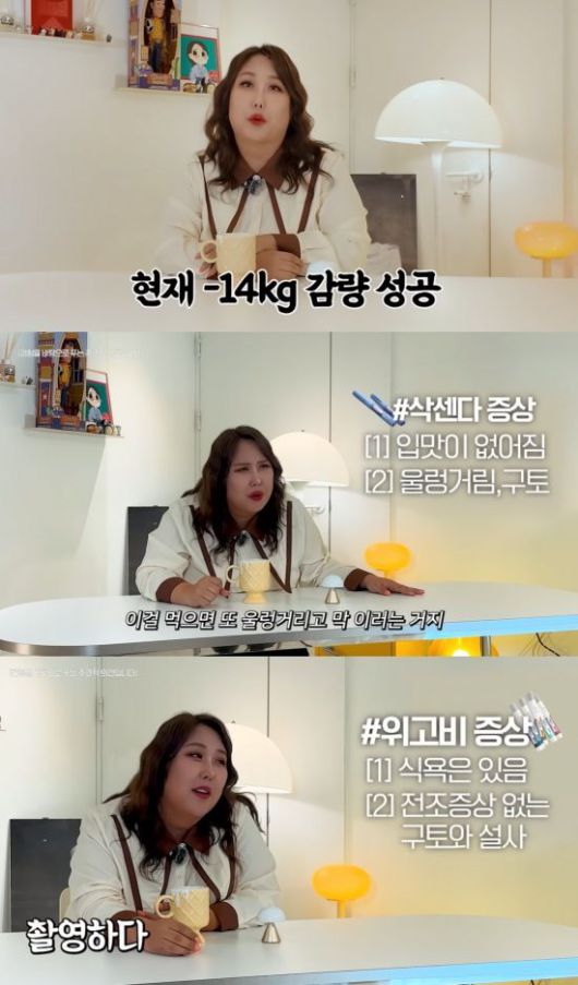 풍자는 삭센다를 맞고 한달 반 만에 총 7㎏가 빠졌다면서도 부작용을 겪었다고 했다. 그는 "정말 입맛이 없어진다. 그런데 울렁거리는 부작용도 온다. 체했는데 누가 내 옆에서 부침개를 부치는 것 같았다. 용량을 올리니 배를 타고 바다 한가운데에 있는 것처럼 멀미가 엄청 왔다"고 말했다.