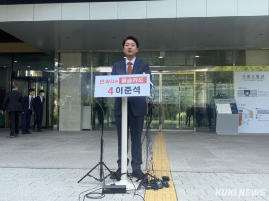 이준석 개혁신당 대선 후보가 27일 오후 국회소통관 앞에서 긴급 기자회견을 하고 있다. 송금종 기자 |