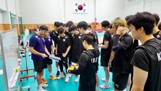 ▲ 이사나예 감독(왼쪽) 설명을 듣는 남자 배구 대표팀 선수들