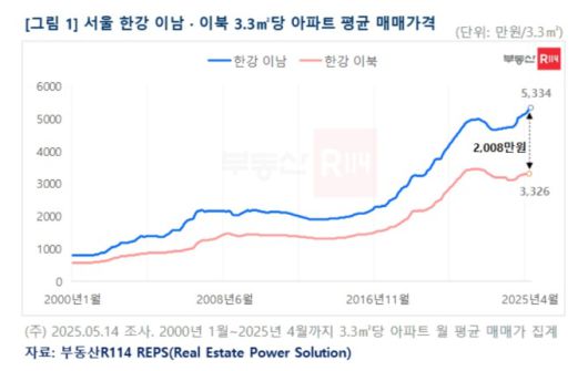 27일 부동산R114는 서울 한강 이남·이북 지역의 지난달 아파트 매매 가격을 조사한 결과 한강 이남 지역 11개구 아파트의 3.3㎡당 평균 매매가는 5천334만원으로 한강 이북 14개구 평당가(3천326만원)보다 2천8만원(60.4%) 높았다고 밝혔다.