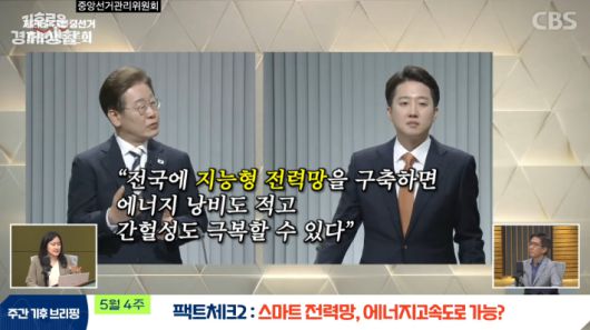 그뿐만 아니라 전력망 개편을 통해서 에너지를 효율적으로 사용하는 것도 중요하다는 얘기들이 나오고 있어요. 이재명 후보가 재생에너지 확대를 강조하다 보니까 당연히 이런 대안들을 언급했는데요. 어떻게 말했냐면, 앞으로는 전국의 모든 전력망이 지능형으로 다 연결되고, 자동차 배터리 같은 걸 꽂아놨다가 안 쓸 때는 배터리에 있는 전기도 빼서 다른 곳으로 공급하는 식으로 하면서 "전국에 지능형 전력망을 구축하면 에너지 낭비도 적고 간헐성도 극복할 수 있다"고 했습니다.