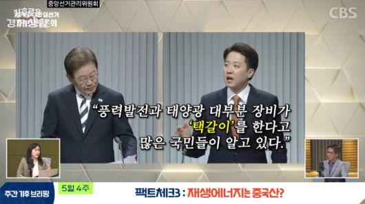 ◇ 최서윤> 예, 중요해 보입니다. 다음 쟁점도 볼게요. 말씀하셨지만 투표가 가까워지면서 선거가 네거티브전으로 치닫고 있어요. 그래서 나온 막말인 것 같긴 한데 살펴보지 않을 수가 없어서 가져왔습니다. 중국산 장비 문제. 김문수 후보 같은 경우에는 지나가는 말로 "내 운동권 친구들이 다 태양광 하고 있는데 거기가 비리의 온상이다"라는 얘기도 했고요. 이념적인 공격이었죠. 이준석 후보 같은 경우에는 두 번의 토론회에 걸쳐서 계속 중국 얘기를 했어요. 첫 번째 토론회에서는 "우리나라 지금 태양광 풍력 확대가 중국을 위한 거다"라고 말을 했고요. 두 번째 토론회에서는 아예 "국내 풍력발전과 태양광 대부분 장비가 중국산 장비 가져다가 '택갈이'를 한다고 많은 국민들이 알고 있다"라고 발언을 했거든요.