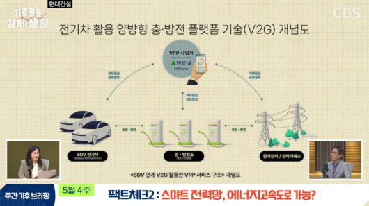 ◇ 최서윤> 이 개념이 V2G, 즉 Vehicle to Grid입니다. 전력망에 자동차를 직접 연결해서 양방향으로 주고받게 하는 시스템을 통한 전력망 개편을 제안한 거예요. 이렇게 하면은 앞으로 전기차 시대가 열릴 텐데 주행 중에 남은 전력을 건물 같은 곳에 공급하고 판매하게 되는 거죠. 앞으로 재생에너지, 전기차 이용이 보편화되면 이건 필연적인 거예요. 미래 국가 전력망을 구축해서 가져가야 하는 그런 계획으로 저는 봤습니다.