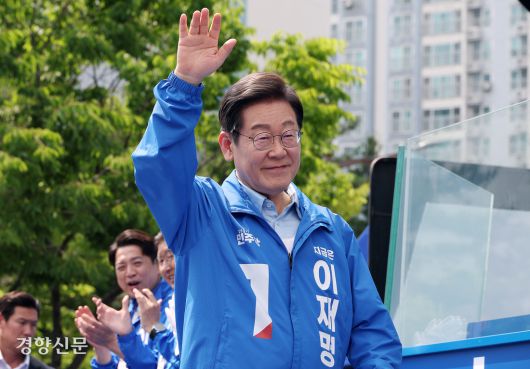 이재명 더불어민주당 대선 후보가 지난 26일 경기 용인시 단국대 죽전캠퍼스 정문 앞에서 시민들에게 손을 흔들며 지지를 호소하고 있다. 박민규 선임기자 |