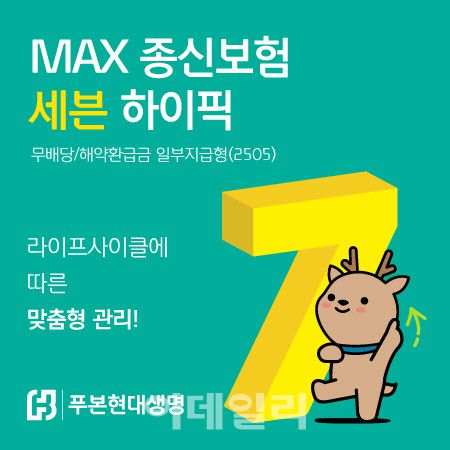 [이데일리 양희동 기자] 푸본현대생명은 사망 보장과 라이프사이클에 따른 맞춤형 위험관리가 가능한 ‘맥스(MAX) 종신보험 세븐 하이픽’을 출시했다고 27일 밝혔다. 맥스 종신보험 세븐 하이픽은 고객의 라이프사이클에 따라 사망보장과 연금전환(전환 후 중도인출, 추가납입) 등을 다양하게 활용 가능한 것이 특징이다. 또 사망보험금 체증을 통한 고액의 보장자산을 준비할 수 있다.