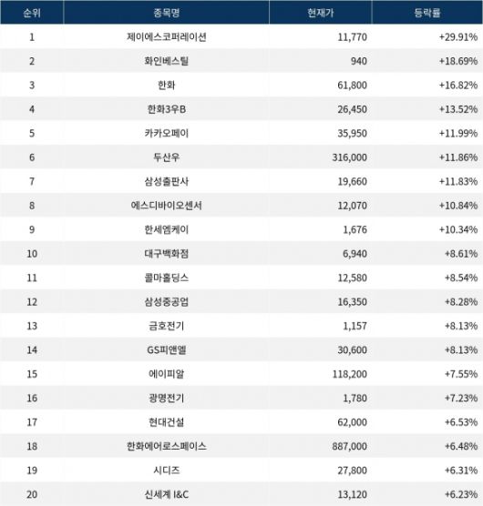 이어 상승률 2위 화인베스틸(133820)은 주가가 18.69% 급등하며 종가 940원에 상승 마감했다. 상승률 3위 한화(000880)의 주가는 61,800원으로 16.82% 급등하며 우수한 성적을 기록했다. 상승률 4위 한화3우B(00088K)는 13.52% 상승하며 26,450원에 마감했다. 상승률 5위 카카오페이(377300)는 11.99%의 상승세를 타고 종가 35,950원에 마감했다.