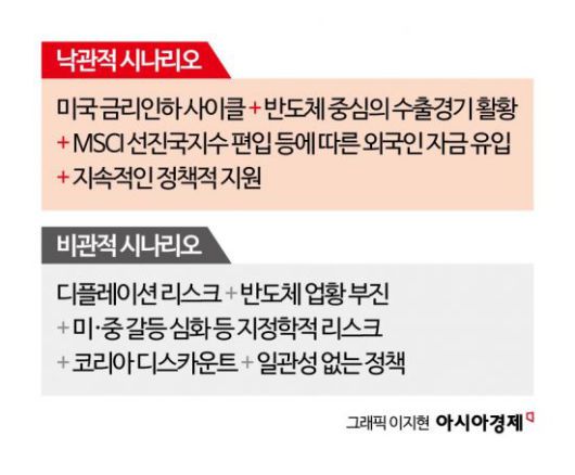 낙관적인 시나리오에서는 미국의 금리 인하 사이클, 반도체 중심의 수출 경기 활황, MSCI 선진국지수 편입 등에 따른 외국인 자금 유입 등의 환경에 지속적인 정책 지원까지 더해져 코스피 레벨업이 가능할 것으로 관측됐다. 반면 디플레이션 리스크, 반도체 업황부진, 미·중 갈등을 비롯한 지정학적 리스크가 이어지는 상황에서 정책 일관성마저 떨어질 경우 코리아 디스카운트 상태를 벗어나기 어려울 것으로 예상된다.