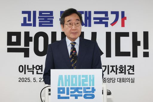 새미래민주당 이낙연 상임고문이 27일 서울 여의도 중앙당사에서 긴급 기자회견을 열고 국민의힘 김문수 후보 지지를 선언하고 있다. 연합뉴스