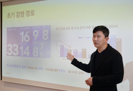 심영섭 구글 클라우드 맨디언트 컨설팅 한국·일본 총괄이 27일 서울 중구 서울스퀘어에서 열린 미디어 브리핑에서 연례 조사보고서 'M-트렌드 2025' 주요내용을 발표하고 있다./사진제공=구글 클라우드 |