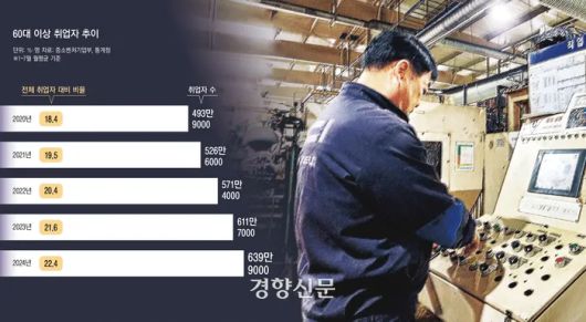 한국의 65세 이상 노인 고용률이 경제협력개발기구(OECD) 회원국 중 1위이지만, 65세 노인 3명 중 1명은 단순노무직에 종사하는 등 고령층 일자리의 질은 낮은 것으로 나타났다. 연금 소득이 최저 생계비에도 미치지 못해 은퇴할 수 없는 노인들은 재취업에 성공하더라도 상당수가 영세한 사업장에서 비정규직으로 저숙련·단순노동을 하고 있다는 것이다.