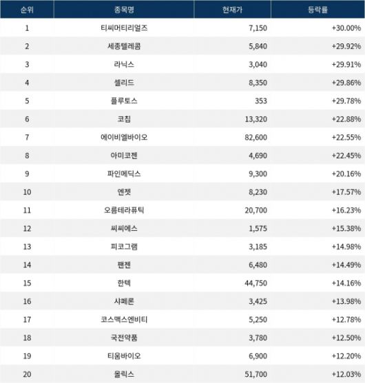 6위 코칩(126730)은 종가 13,320원으로 +22.88% 상승 마감했다. 7위 에이비엘바이오(298380)는 종가 82,600원으로 +22.55% 상승 마감했다. 8위 아미코젠(092040)은 종가 4,690원으로 +22.45% 상승 마감했다. 9위 파인메딕스(387570)는 종가 9,300원으로 +20.16% 상승 마감했다. 10위 엔젯(419080)은 종가 8,230원으로 +17.57% 상승 마감했다.