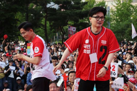 ▲국민의힘 김문수 대선 후보가 26일 서울 도봉구 방학사거리에서 유세하는 가운데 한동훈 전 대표가 지원유세를 마치고 단상을 내려가고 있다. ⓒ연합뉴스 |