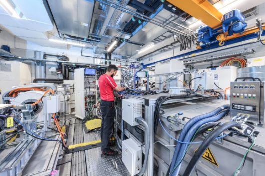 포르쉐 직원이 지난 15일(현지시간) 독일 슈투트가르트 인근 바이작 연구개발센터에 설치된 시험 설비에서 전기차 주행 관련 테스트를 위해 센서 배선을 연결하는 작업을 하고 있다. 포르쉐 제공 |