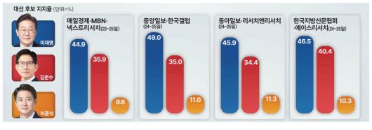 중앙일보와 한국갤럽이 지난 24~25일 전국 만 18세 이상 유권자 1004명을 대상으로 조사한 결과에서는 이재명 후보가 다자 대결에서 49%를 얻었다. 이어 김문수 후보가 35%, 이준석 후보는 11%를 얻었다.