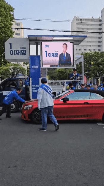 26일 대구 수성구 신매광장에서 열린 박주민 더불어민주당 의원의 지원유세 현장에서 한 차량이 선거운동원들을 향해 돌진하는 모습. 민주당 대구시당 제공 |