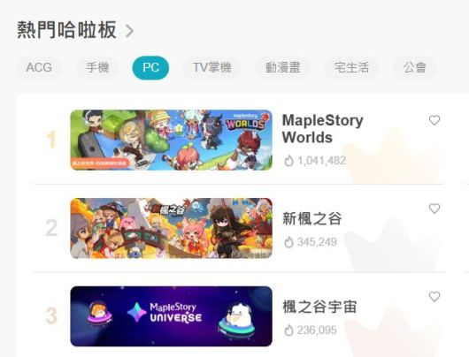 ▲ 대만 최대 게임 웹진 ‘바하무트’ 인기 순위 점령한 ‘메이플스토리’ IP