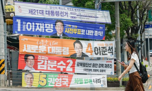 대한민국 누가 이끌까 6·3 대선을 일주일 앞둔 27일 서울 성북구 정릉동의 한 도로변에 더불어민주당 이재명, 국민의힘 김문수, 개혁신당 이준석, 민주노동당 권영국 후보(기호순)의 현수막이 걸려 있다. 최상수 기자 |
