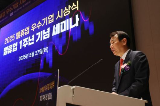 정은보 한국거래소 이사장이 27일 서울 여의도 한국거래소에서 열린 2025 밸류업 1주년 기념 세미나에서 개회사를 하고 있다. 연합뉴스 |