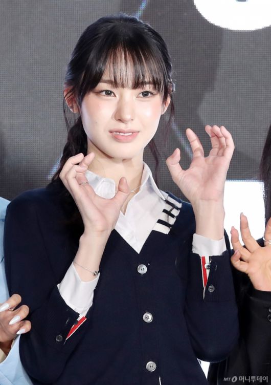 이날 노제는 깔끔한 셔츠와 남색 카디건을 입고 플리츠 미니스커트를 입고 등장했다. 니삭스에 메리제인 슈즈를 매치해 사랑스러운 분위기를 연출했다. 앞머리를 내린 헤어스타일에 누드톤 메이크업을 연출한 노제는 차분한 분위기를 자아냈다.
