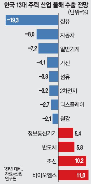 자동차(-8.0%) 일반기계(-7.2%) 철강(-2.1%) 정유(-19.3%) 섬유(-3.3%) 가전(-4.1%) 디스플레이(-2.7%) 2차전지(-3.2%) 등 9개 산업에서는 수출이 전년 대비 줄어들 것으로 관측된다.