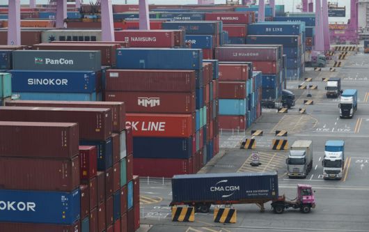 인천 연수구 인천신항 컨테이너터미널에서 컨테이너를 실은 화물차량이 분주하게 오가고 있다. [한주형 기자] |