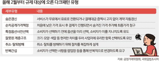 공정위는 2023년 4월 다크패턴 금지 종합대책을 발표한 이후 지난해 2월 사각지대에 있던 6개 유형을 새롭게 제재 대상에 추가, 전자상거래법을 개정했다. 이 법이 올해 2월부터 시행되면서 숨은갱신 외에 첫 페이지에 일부러 가격을 낮게 표시하고 결제가 진행됨에 따라 숨겨진 가격을 차츰 보여주는 ‘순차공개가격책정’, 사업자에게 유리한 옵션을 미리 선택해놓고 소비자가 이를 무심코 지나치도록 유도하는 ‘특정옵션 사전선택’ 등 6개 유형이 제재 대상에 올랐다.