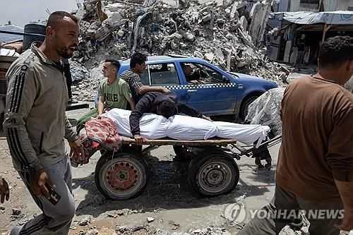 이스라엘 공습에 숨진 이의 시신을 옮기는 팔레스타인인들. |