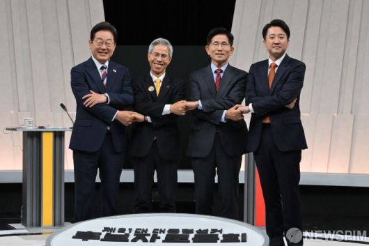 [서울=뉴스핌] 국회사진기자단 = 이재명 더불어민주당(왼쪽부터), 권영국 민주노동당, 김문수 국민의힘, 이준석 개혁신당 대선 후보가 27일 오후 서울 마포구 MBC 스튜디오에서 진행된 정치 분야 TV토론회에 앞서 포즈를 취하고 있다. 2025.05.27 photo@newspim.com |