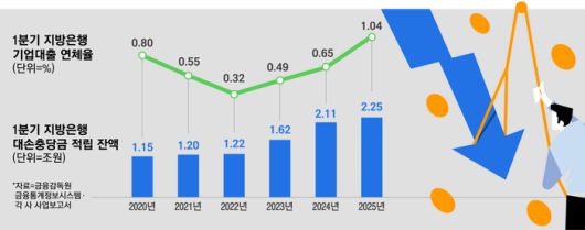 27일 금융권에 따르면 지방은행 5곳(부산·경남·전북·광주·iM뱅크)의 올해 1분기 대손충당금적립잔액은 2조2551억원에 달했다. 코로나19가 본격화되기 직전인 2020년 1분기(1조1519억원)보다 배 가까이 늘어난 규모다. 2023년까지 1조원대를 유지하던 대손충당금은 지난해 2조원대로 불어난 뒤 꾸준히 증가하는 추세다. 지방 경기가 악화하면서 은행들이 부실이 커질 것으로 예상하고 대손충당금 규모를 늘리고 있는 셈이다.