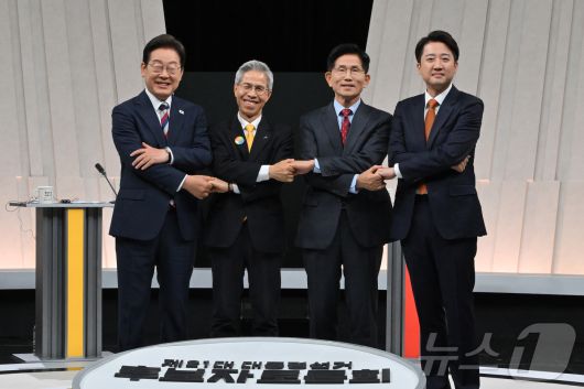 이재명 더불어민주당 대통령 후보(왼쪽부터), 권영국 민주노동당 대통령 후보, 김문수 국민의힘 대통령 후보, 이준석 개혁신당 대통령 후보가 27일 서울 마포구 상암동 MBC 스튜디오에서 진행된 정치 분야 TV토론회에 참석해 포즈를 취하고 있다. 2025.5.27/뉴스1 ⓒ News1 국회사진기자단 |