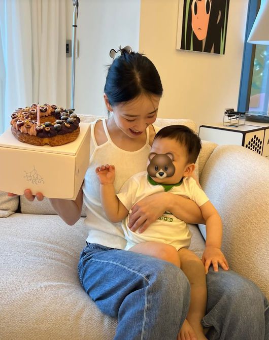사진 속에서 손연재는 머리를 질끈 묶어 올린 편안한 모습으로 한 손에는 케이크, 한 손에는 아들을 품에 안은 채 환한 미소를 보이고 있다.