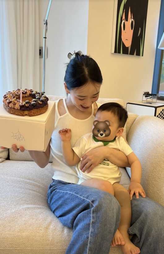 손연재는 27일 자신의 개인 계정에 아들을 품에 안고 소파에 앉은 모습의 사진을 개인 계정에 올렸다. 사진 속 손연재는 청바지에 머리를 묶은 편안한 모습. 품에는 아들을 안고 한 손에는 케이크를 들고 미소짓고 있다.