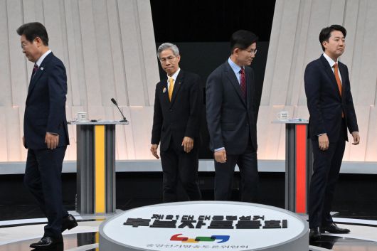 마지막 토론회, 각자의 길로 이재명 더불어민주당 후보와 권영국 민주노동당 후보, 김문수 국민의힘 후보, 이준석 개혁신당 후보(왼쪽부터)가 27일 서울 상암동 MBC 스튜디오에서 진행된 제3차 대선후보 TV토론회에서 기념 촬영 후 자리로 향하고 있다. 국회사진기자단 |