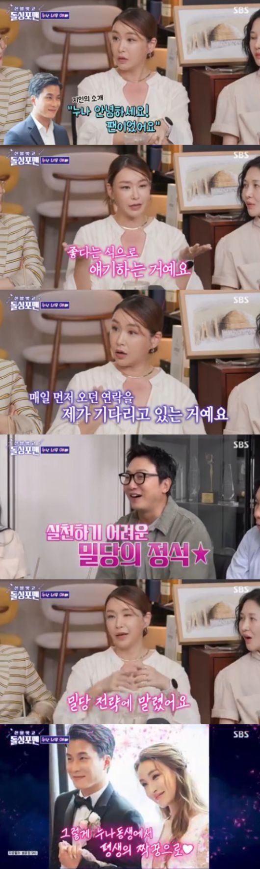 배윤정은 "제가 이혼의 아픔이 있을 시기에 저를 집에서 꺼내줬던 친구다. 3개월을 하루도 안 빼놓고 나를 찾아왔다. 잘 챙겨줬다. 그러다 어느날 연락이 뚝 끊긴거다. 그 때 제가 그 친구의 연락을 기다리고 있더라. 밀당 전략에 말린 것"이라면서 웃었다.