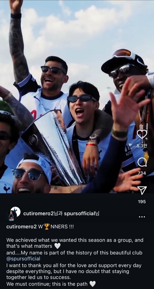 거기다 로메로도 우승 이후 다른 스탠스를 보여주고 있다. 유로파리그 결승 MOM으로 선정되기도 했던 그는 경기 후 "이 우승이 기쁜 것은 우리 주장 손흥민이 우승 트로피를 들어 올려서다. 그는 정말 좋은 사람이다"라면서 "나는 그가 응당히 받아야 할 대우를 받아서 기쁘다"라고 기쁨을 표현하기도 했다.