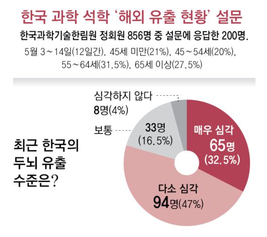동아일보가 한국과학기술한림원과 함께 한림원 회원 200명을 대상으로 설문조사한 결과 61.5%에 해당하는 123명이 최근 5년 이내에 해외 국가에서 영입 제안을 받은 바 있다고 답했다. 제안을 받은 응답자 중 42%(52명)는 제안을 수락해 해외에서 연구 중이거나 제안을 검토하고 있는 것으로 나타났다. 제안을 받지 않은 77명도 83%(64명)는 제안이 들어오면 긍정적으로 검토하겠다고 답했다. 과학계 석학들의 두뇌 유출이 한동안 이어질 수 있음을 예고하는 대목이다.
