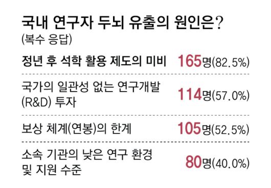 국내 이공계 석학들의 두뇌 유출은 이처럼 국내에서 연구를 오랫동안 지속할 수 없다는 불안감도 큰 원인으로 지목된다. 여기에 정부의 연구개발(R&D) 예산 삭감과 과학자에 대한 낮은 처우 등의 요인이 복합적으로 작용해 이들을 ‘한국 탈출’이라는 막다른 선택으로 내몰고 있는 것이다. 본보가 한국과학기술한림원과 공동으로 회원 200명을 설문한 결과 80%가량은 “한국의 두뇌 유출 상황이 심각한 수준”이라고 답했다.