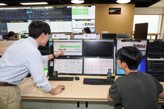 KT 직원들이 경기도 과천에 위치한 KT 통합관제센터에서 DDOS 등 사이버 공격에 대비하며 관제하고 있다. 뉴스1 |