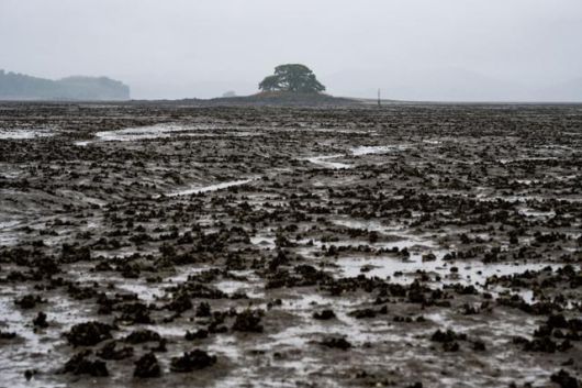 우도 주위 갯벌에 굴이 빼곡히 자라 있다. |