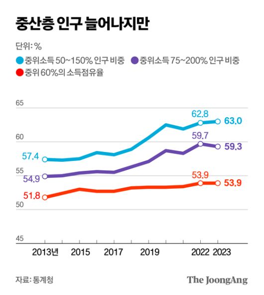 전체 소득 분포에서 중산층의 위치를 가늠할 수 있는 ‘중위 60%의 소득점유율(처분가능소득 기준)’ 또한 2013년 51.8%에서 2023년 53.9%로 증가했다. 각종 통계상으로는 중산층 인구와 경제력이 10년 전보다 커졌다는 의미다. 한국의 중산층 인구 비중이나 소득점유율은 OECD 회원국 평균과 비슷하거나 조금 더 양호한 수준이다.